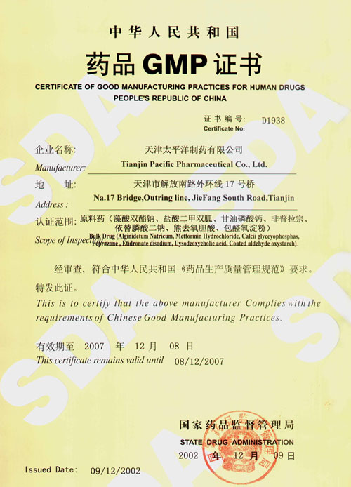 GMP(Good Manlfacturing Practices) certificate is issued by the Pharmaceutical Supervise Bureau of the PRC, meanwhile it is the certificate for the pharmaceutical enterprise by the PRC, the certificate for the product technology of the pharmaceutical enterprise, and meanwhile it is a supervise system for the quality of the medicine. All these guaranteed the safe using of the medicine for people.